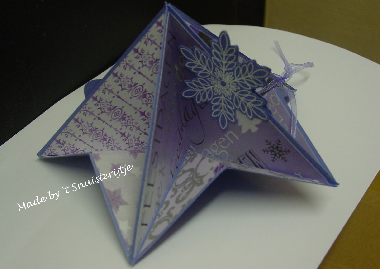 Vanmiddag ben ik weer even lekker aan het freubelen geweest, ik had een hele mooie sterkaart gezien gemaakt door Wilga van mijn Paper Passions , ik vond hem zo leuk maar er stond geen patroon bij, na goed kijken en vouwen met een vierkant kladpapiertje toen viel bij mij eindelijk het kwartje hoe de ster gemaakt is.
